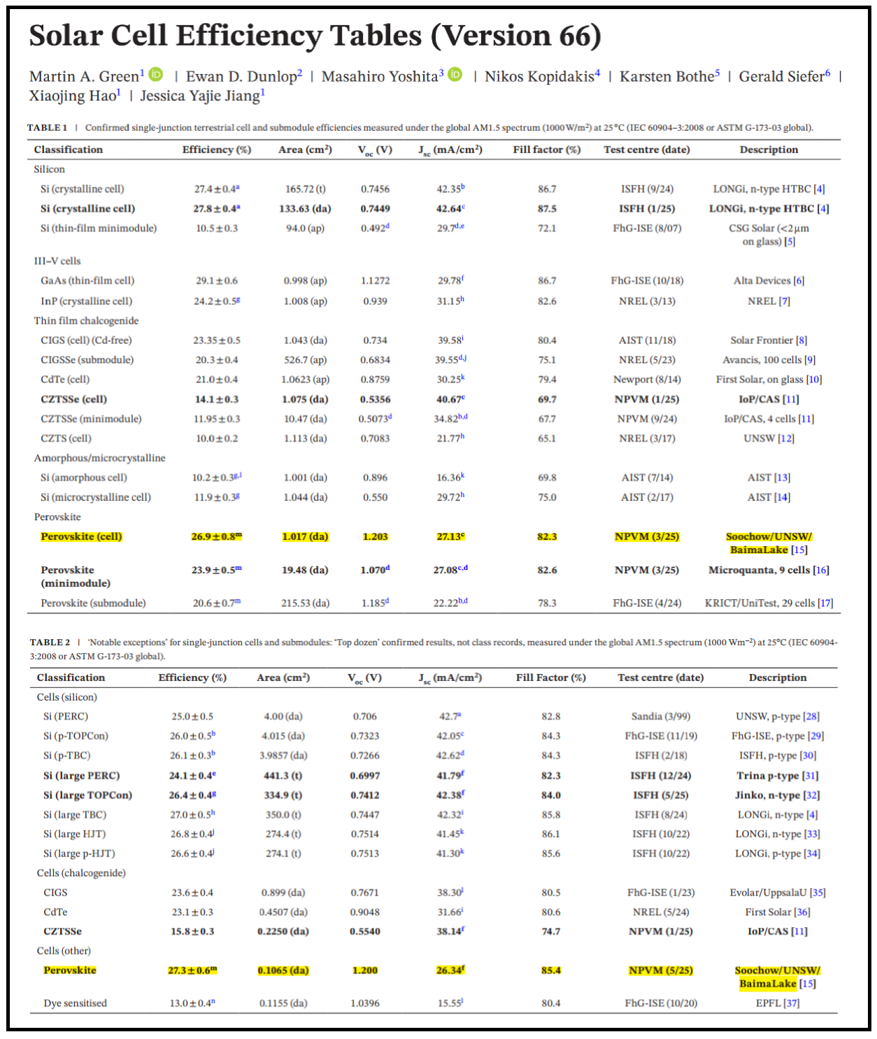 Solar Cell Efficiency Tables(Version 66)部分截圖