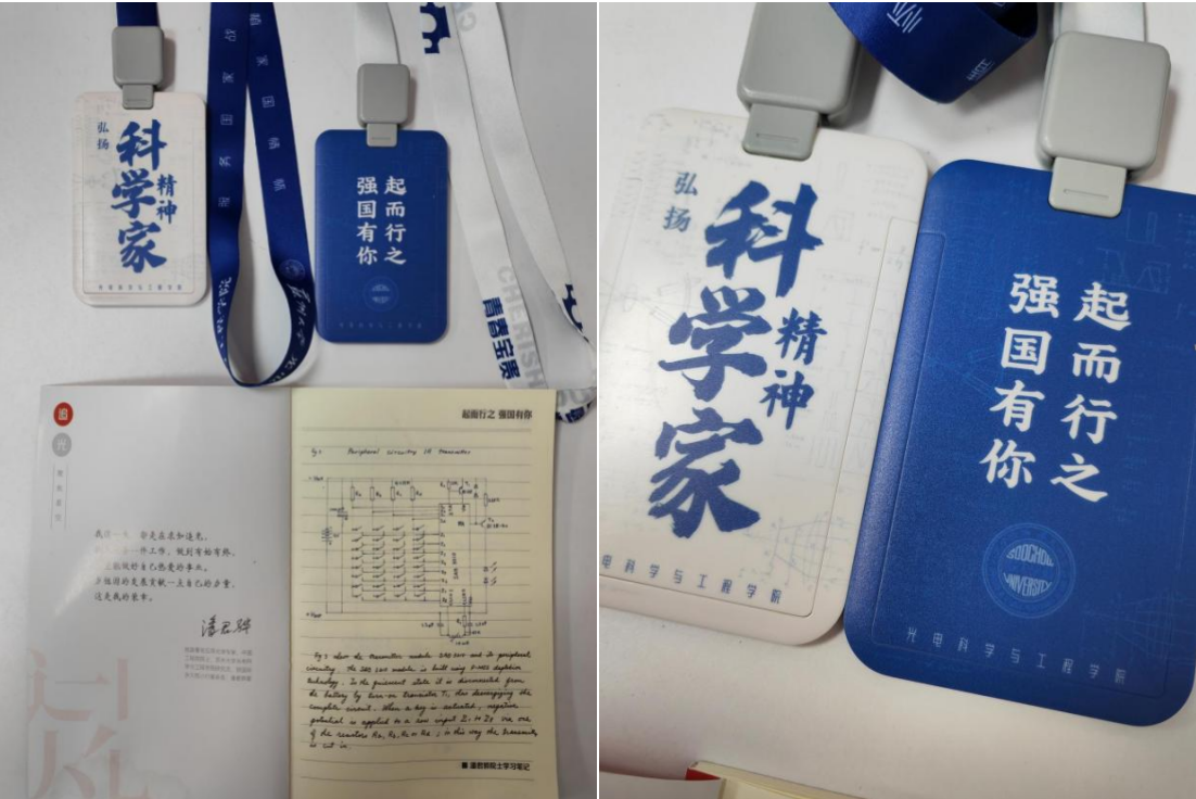 光電科學(xué)與工程學(xué)院以“科學(xué)家精神”為主題準備了入學(xué)禮包,其中包括印有潘君驊院士筆記原稿的“追光”筆記本等周邊,勉勵新時代光電學(xué)子勇做光電弄潮兒。