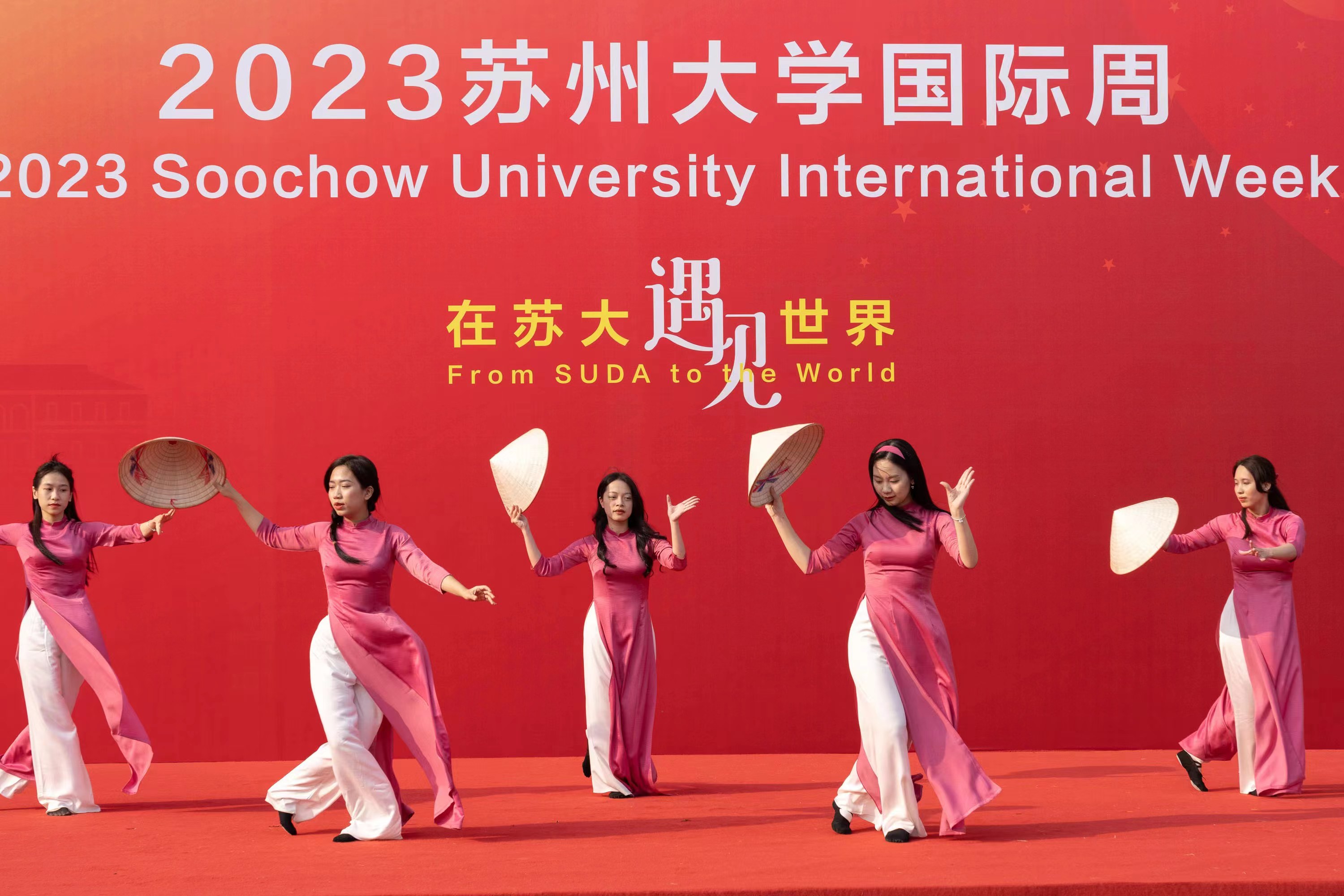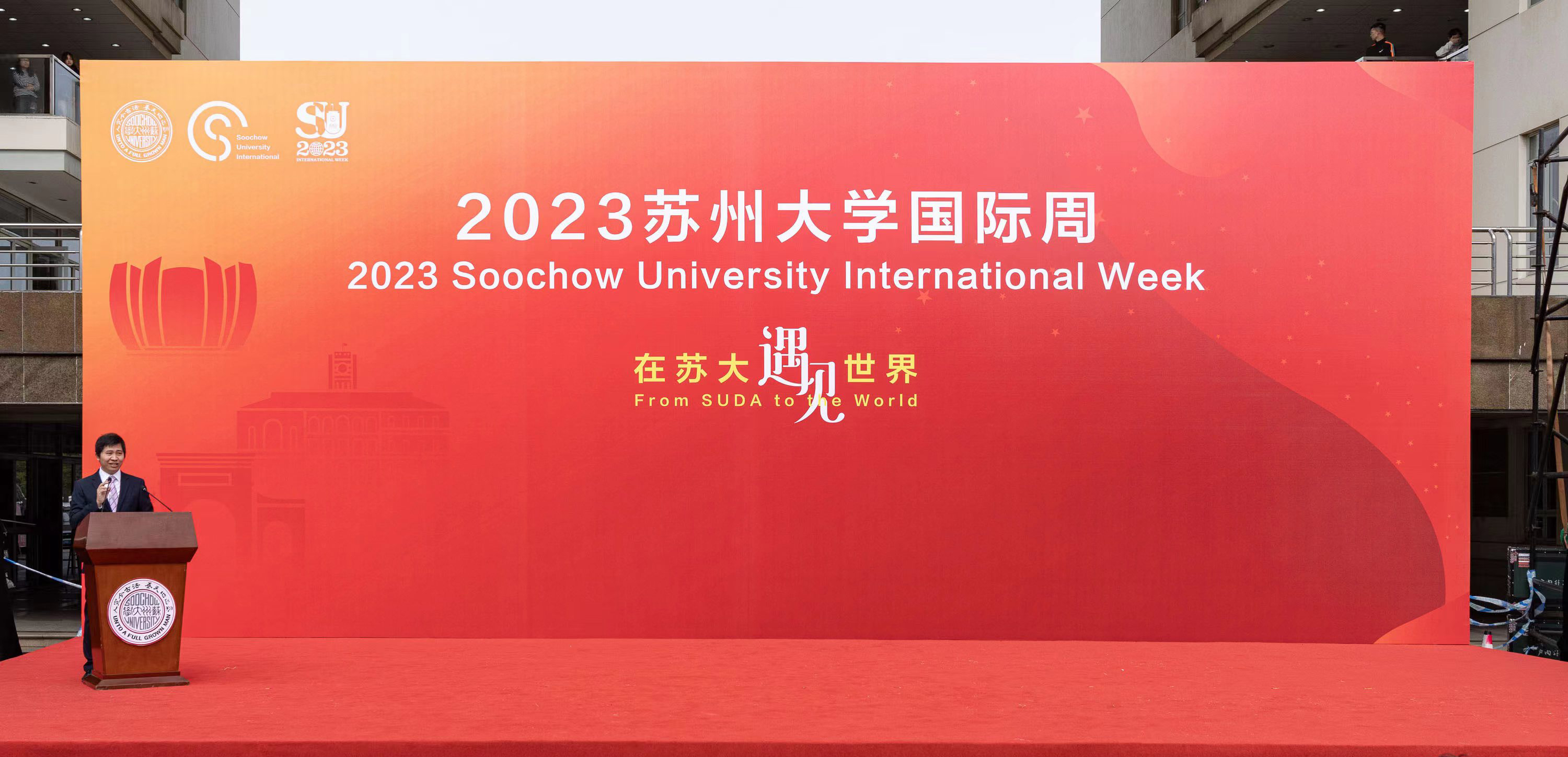為搭建和諧互鑒、美美與共的文化交流平臺,彰顯蘇州大學的國際化特色和多元文化氣息,10月14日,2023年蘇州大學國際周活動在天賜莊校區理工大樓南草坪舉行。省教育廳對外合作與交流處副處長汝益仙,蘇州市外事辦公室處長趙崢,我校副校長李孝峰,國際創新藥學院外方院長、愛爾蘭皇家外科醫學院教授Brian Kirby,我校相關部門負責人以及各校外友好合作單位代表出席開幕式。開幕式由我校國際合作交流處處長何樂主持。