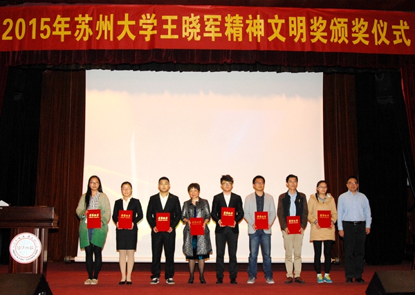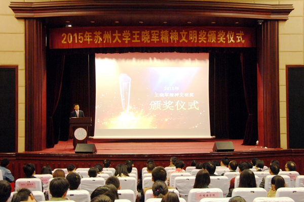 10月28日晚,2015年蘇州大學王曉軍精神文明獎頒獎儀式在本部敬賢堂舉行。校黨委副書記、副校長江作軍參加儀式并講話。王曉軍生前在法學院的同班同學、校友代表石榮律師,校精神文明建設(shè)領(lǐng)導小組成員單位和各學院(部)的領(lǐng)導及師生代表參加了本次活動。頒獎儀式由黨委宣傳部副部長吳江主持。