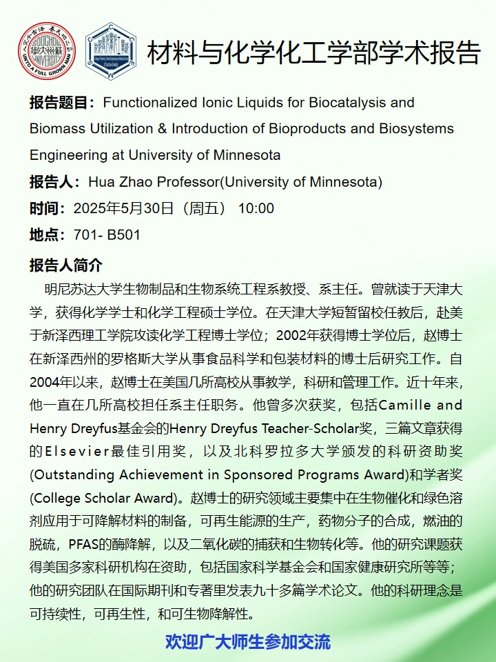 材料與化學化工學部學術報告:Functionalized lonic Liquids for Biocatalysis andBiomass Utilization & Introduction of Bioproducts and BiosystemsEngineering at University of Minnesota
