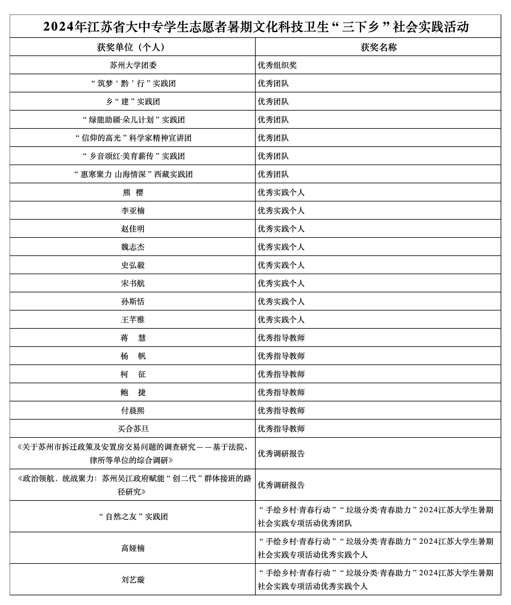 在2024年江蘇省大中專學生志愿者暑期文化科技衛生“三下鄉”社會實踐活動中,我校團委獲評優秀組織獎,“筑夢‘黔’行”實踐團、鄉“建”實踐團、“綠能助疆·朵兒計劃”實踐團、“信仰的高光”科學家精神宣講團、“鄉音頌紅·美育薪傳”實踐團、“惠寒聚力 山海情深”西藏實踐團獲評優秀團隊;熊櫻、李亞楠、趙佳明、魏志杰、史弘毅、宋書航、孫斯恬、王芊雅獲評優秀實踐個人;蔣慧、楊帆、柯征、鮑捷、付晨熙、買合蘇旦獲評優秀指導教師;《關于蘇州市拆遷政策及安置房交易問題的調查研究——基于法院、律所等單位的綜合調研》《政治領航,統戰聚力:蘇州吳江政府賦能“創二代”群體接班的路徑研究》獲評優秀調研報告。在“手繪鄉村·青春行動”“垃圾分類·青春助力”2024江蘇大學生暑期社會實踐專項活動中,“自然之友”實踐團獲評優秀團隊,高婭楠、劉藝璇獲評優秀實踐個人。